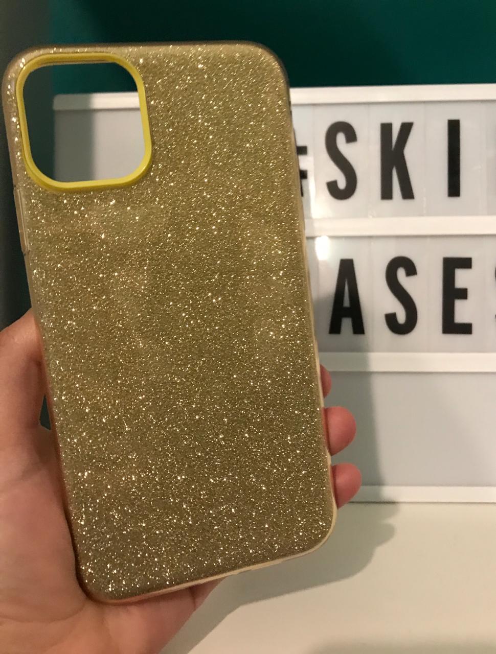 Funda semirrígida con brillos (recubiertos con silicona), el orificio permite ver el logo.
